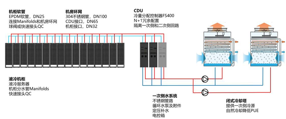 數據中心液冷解決方案,由“室外一次側液冷循環系統(以冷卻塔為主)+機房內二次側液冷循環系統(CDU為主)+液冷服務器”構建。系統組成如下圖所示: