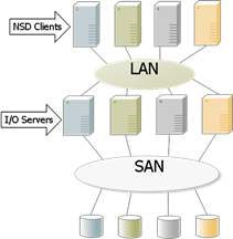 GPFS采用了水平結構的設計,支持SAN組織形式或NSD組織形式(或兩者的混合),在架構上每一層都可以得到擴展,避免了互相的牽連性以及性能的制約性。