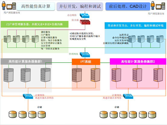 結合數字化設計流程,將設計、仿真(計算、優化、前后處理、CAD設計)應用集中到高性能計算系統上,確保項目涵蓋數字化設計的整個過程。為了保證易用性,高性能計算系統通過瀏覽器,用一個統一的門戶實現:CAD設計和CAE前后處理等三維圖形應用軟件的使用和調度管理、仿真類及優化類應用軟件的使用和調度管理,從而建設一個涵蓋設計、仿真、優化、前后處理統一的綜合應用服務平臺,為設計師提供高效的計算、設計環境。